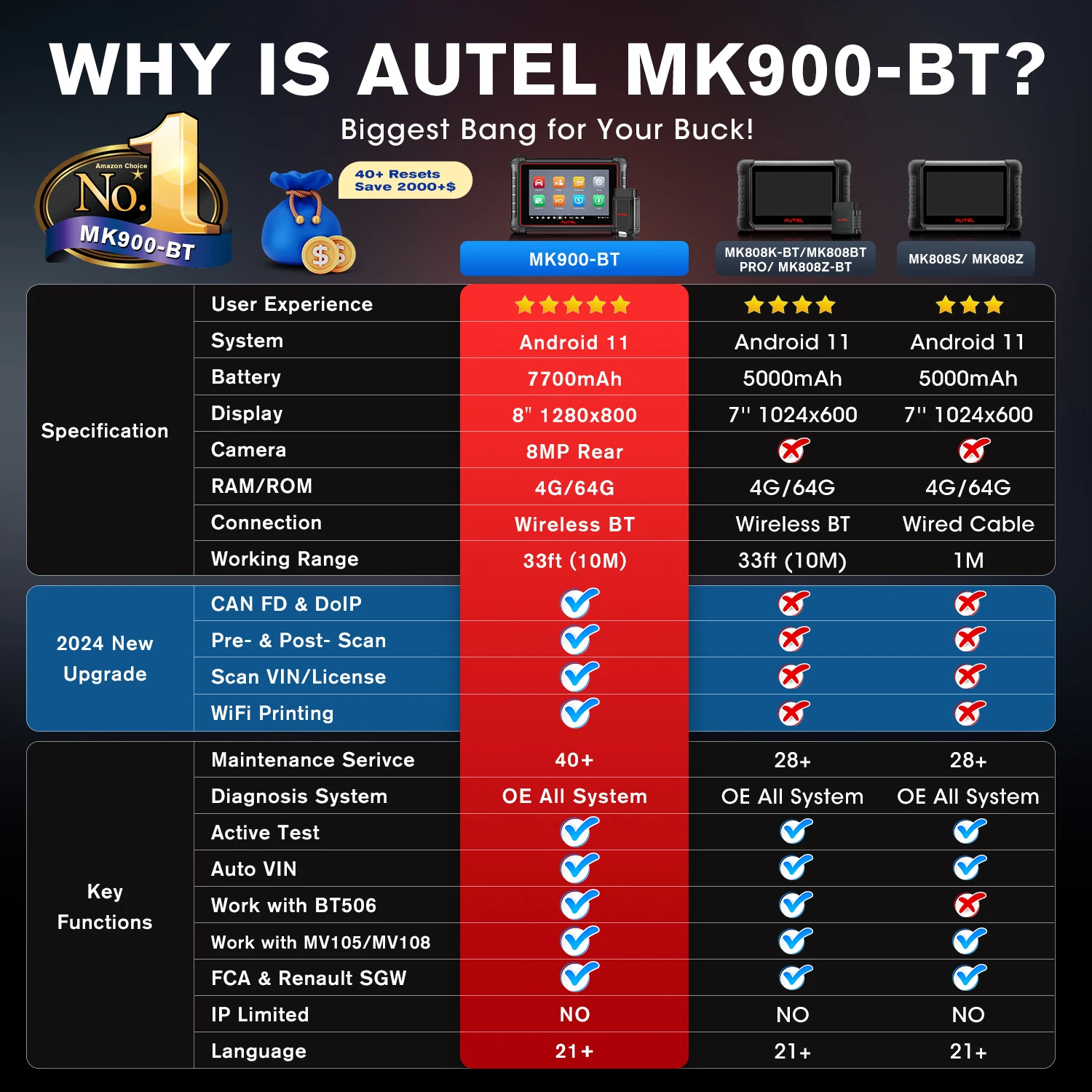 As 2025 updated ver. of OBD2 code reader MK808S MK808, Autel MK900BT auto diagnostic scanner offers 40+ service for mechanics solve issues on 10,000 vehicles from 1996-2023-2024. Hottest Services like: Oil Reset, ABS Bleed, SRS, Throt.tle Reset, Gearbox Reset, Battery Matching etc. Added advanced resets: occupan.cy se.at dete.ction, rain s.lash light sensor reset, H.V.A.C/ S.U.S calib.ration etc.