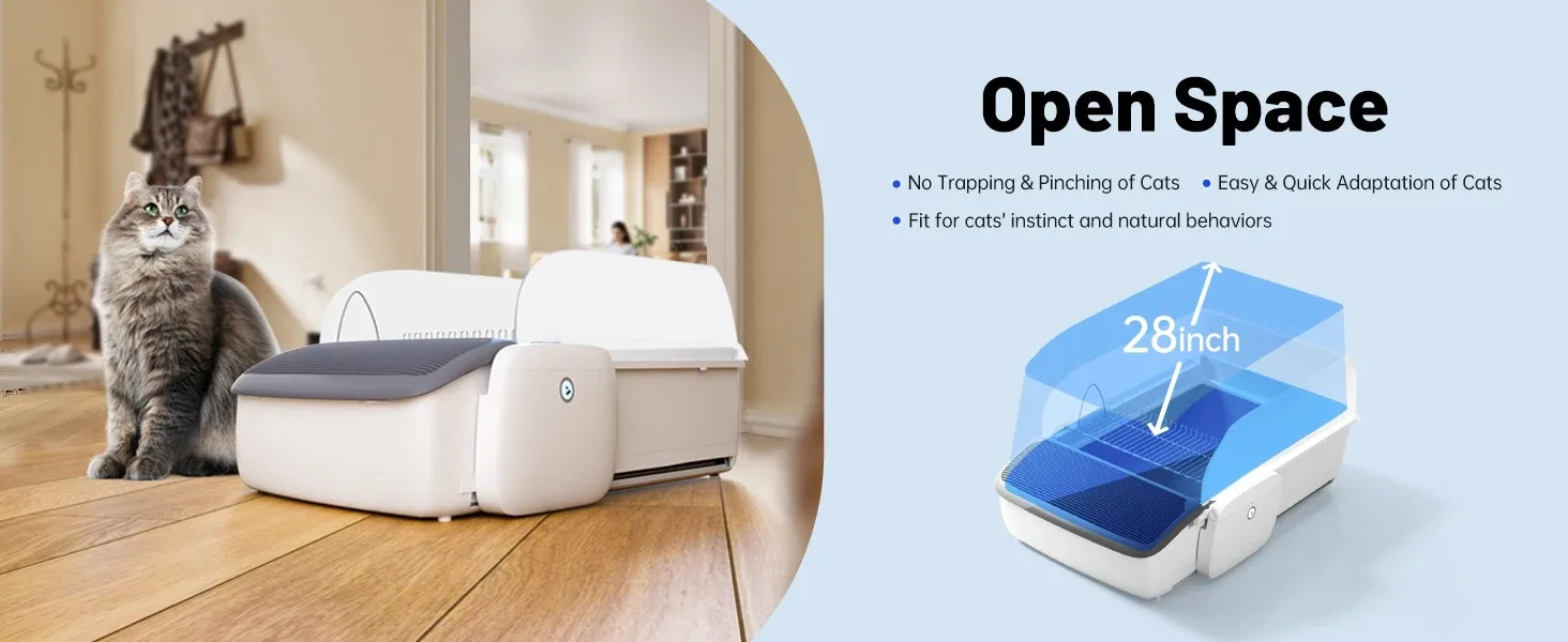 Spacious, Open-Top Design - Cat-Friendly Comfort: Unlike traditional drum-style litter boxes, the M1 Pro features an open-top, high-sided design, creating a comfortable and stress-free environment. Its large capacity (25.8"L x 17.9"W x 11"H x 28"D) accommodates big cats, senior cats, and multiple cats with ease