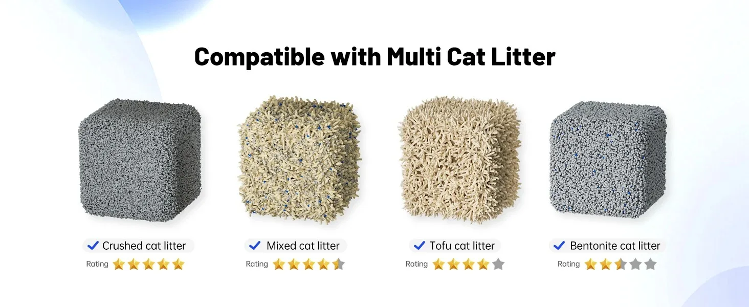 Advanced Odor Control - Keep Your Home Fresh: With E20 deodorizer, this odor-control litter box neutralizes unpleasant smells, keeping your space fresh. Compatible with low-tracking eco tofu cat litter and clumping cat Litter, it provides superior moisture absorption and odor elimination