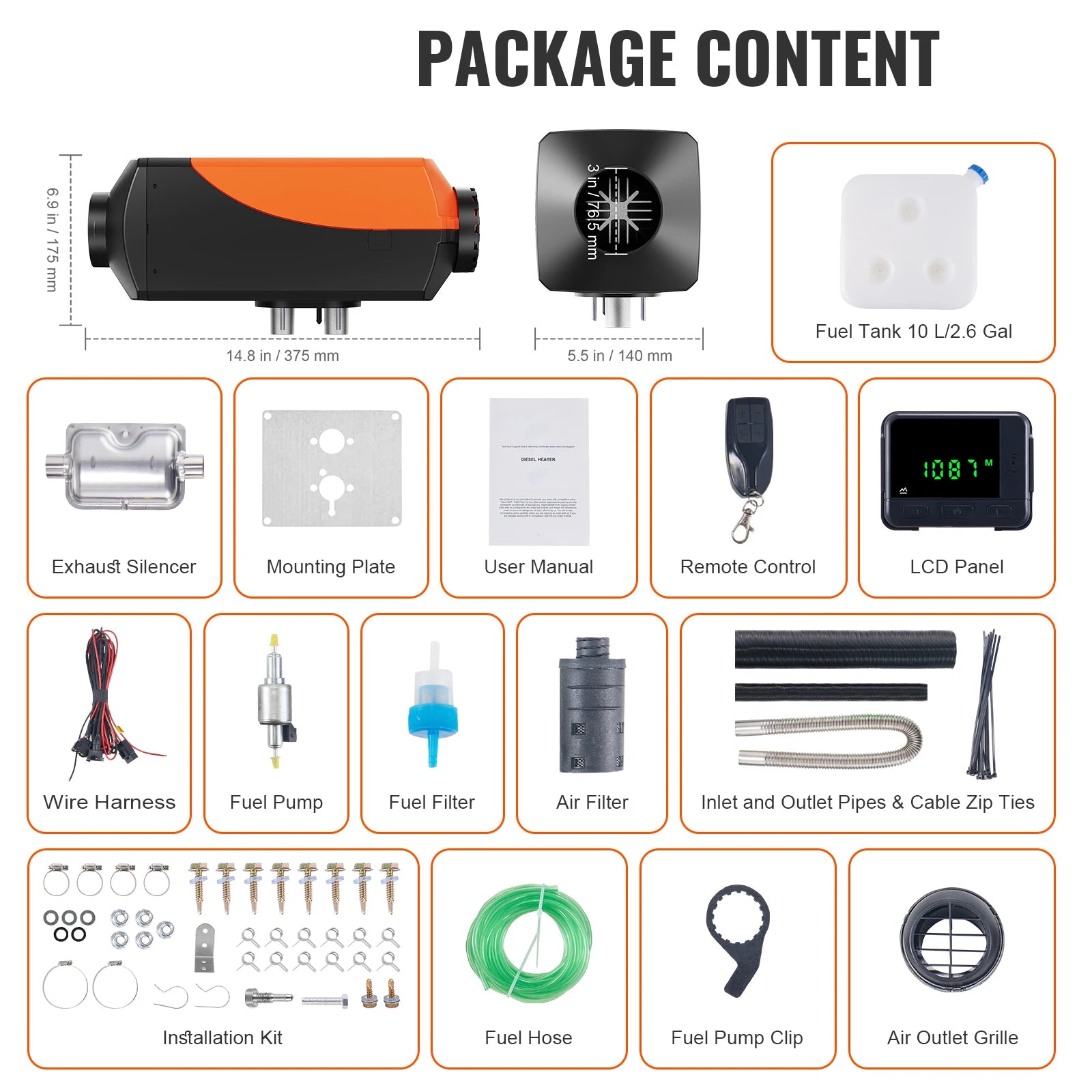 Low Energy Consumption & High Output: Save on fuel costs with our diesel air heater's precision low-noise fuel pump, consuming only 1 gallon per night and reducing fuel consumption to a range of 0.16-0.62 L/h. With a 10 L/2.6gal large capacity fuel tank, the portable diesel heater can provide continuous heat for up to 16 hours, maximizing fuel efficiency and minimizing energy waste.